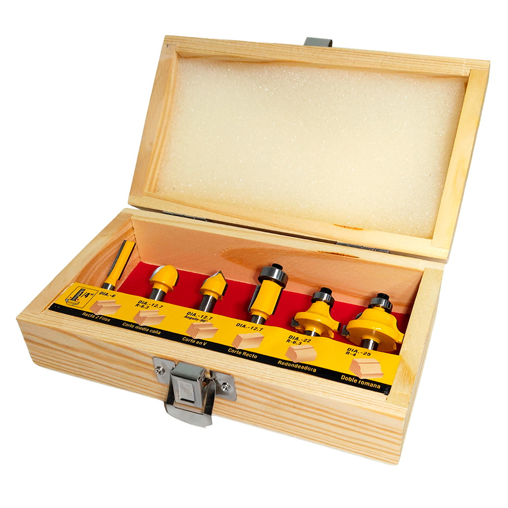 Modelo: CQT006 Uso: Profesional Encastre: 1/4" Cantidad: 6 Pcs Ver más juegos de fresas. Más Información.