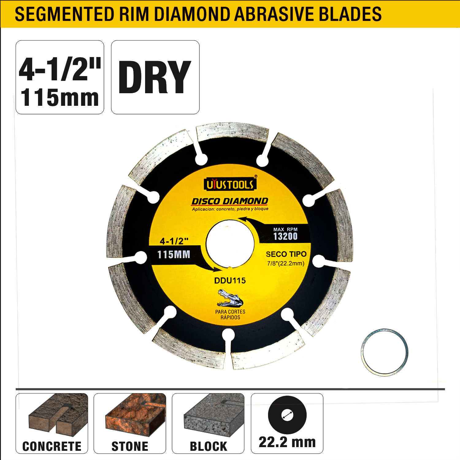 Código: DDU115 Disco Segmentado Uyustools DDU115 para corte concreto, bloques, ladrillo y piedra. puede usarse en amoladoras como en Sierras marmoleras. Segmentos de diamante para mayor durabilidad y rendimiento. Afilado y duradero. Ver más modelos de Discos Diamantados Segmentados. Más información.
