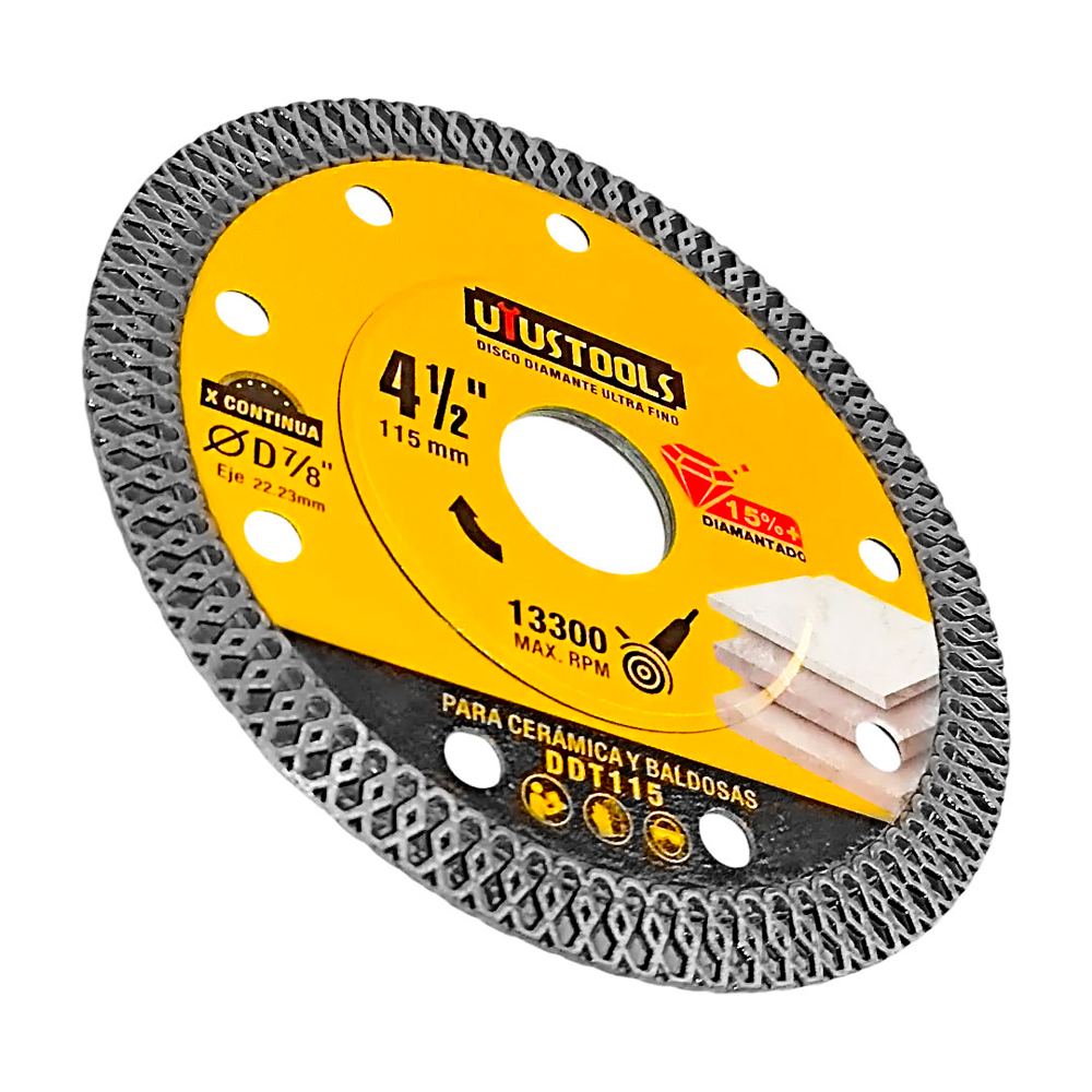 Código: DDT115 Uso: Industrial Tipo de Disco: Continuo Diámetro del Disco: 4.5" (115 mm) Eje: 7/8" (22.23 mm) Adaptador: 20 mm Máxima RPM:13300 rpm