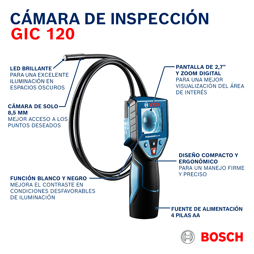Código: 0601.241.200-000 Modelo: GIC 120 C Ideal para examinar áreas de difícil acceso, así como para documentar los resultados. Transfiere las imágenes y los vídeos directamente mediante un cable micro USB. Además la tecnología Dual Power Source permite el uso tanto con una batería de litio de 12 V como con pilas alcalinas convencionales.. Tecnología Quick Connector, que permite cambiar el cable de la cámara de forma rápida y sencilla, así como guardar la herramienta de manera organizada. Cable de cámara de 120 cm con una potente luz LED incorporada. Ver más modelos de Cámara de Inspección. Más información.