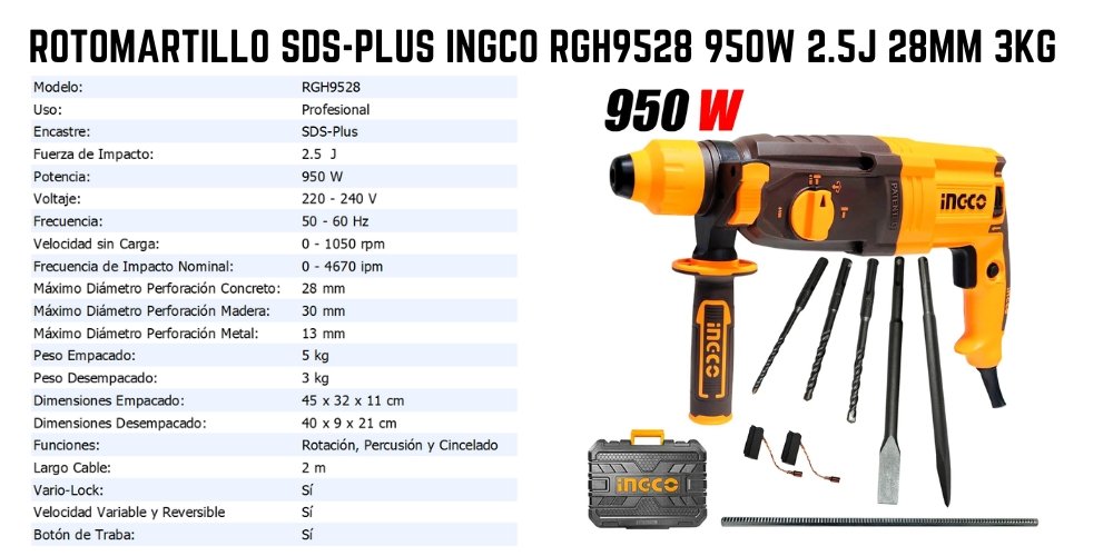 - En primer lugar el Rotomartillo SDS-Plus Ingco RGH9528 es lo que necesitas para trabajos pesados, seas persona aficionada o un profesional.
