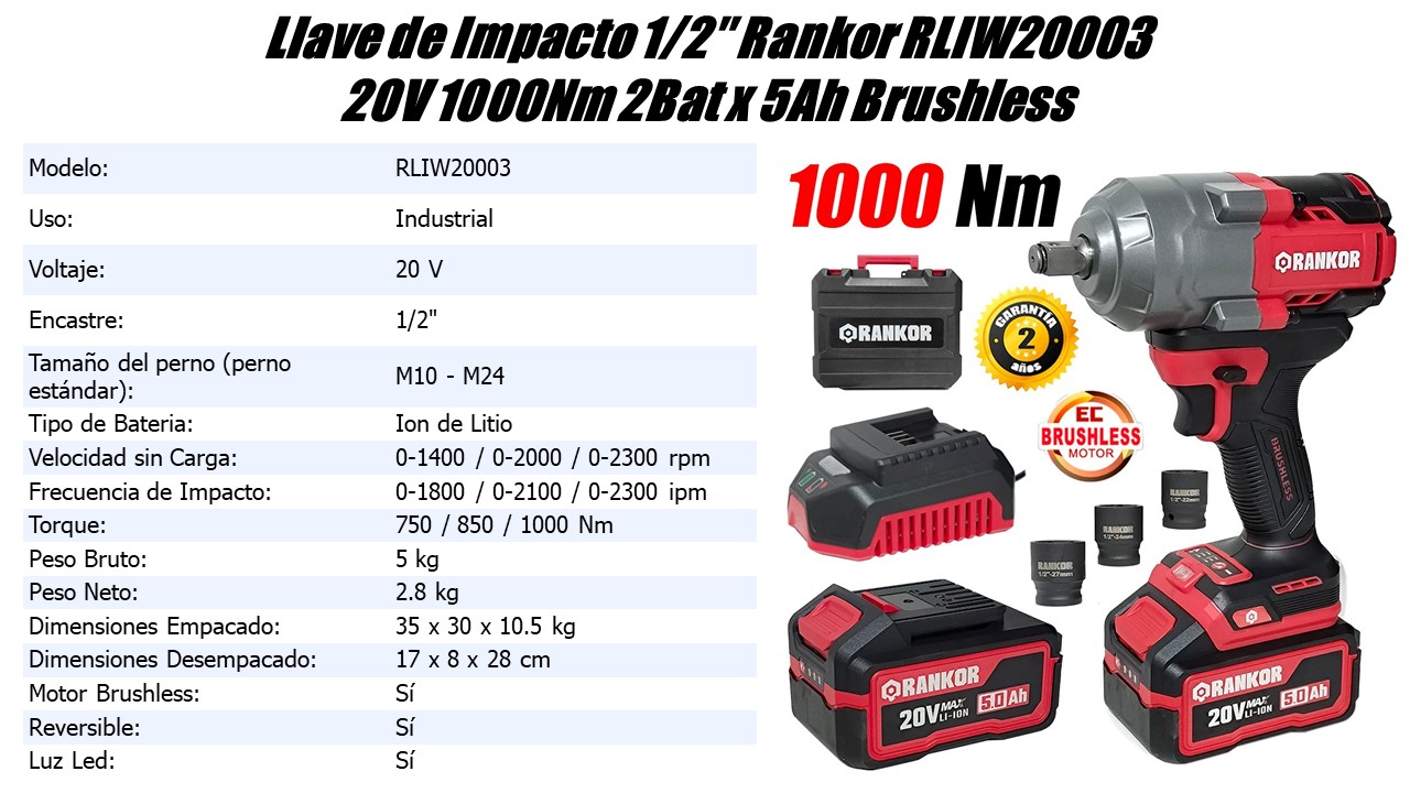 - En primer lugar la Llave Impacto Rankor RLIW20003 es una herramienta Industrial de alto rendimiento diseñada para trabajos exigentes de apriete y afloje de tornillos, pernos y tuercas en entornos industriales, automotrices y de construcción.