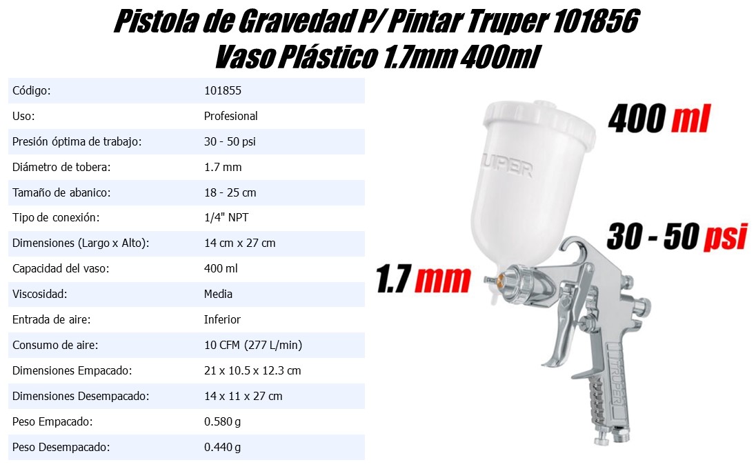 Pistola de Gravedad P/ Pintar Truper 101856 Vaso Plástico 1.7mm 400ml